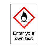 Product Name: Custom Oxidising COSHH Sticker Additional Product Description: This sticker can be customised with text to display liquids, gases or other substances which can combust if they exposed to air. Custom Text...